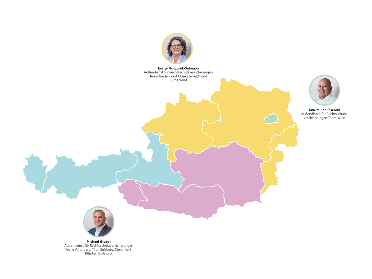 Der ERGO Außendienst Rechtsschutz ist österreichweit in verschiedenen Vertriebsregionen organisiert, die jeweils von einem Gebietsleiter geführt wird. Die zuständige Führungskraft in Ihrer Region freut sich auf Ihre Bewerbung!